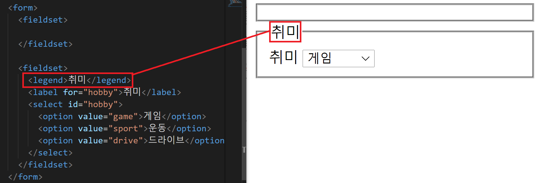 이 요소는 <fieldset>의 제목을 정하는 요소이기 때문에 <fieldset>밖에서 사용하면 그 의미를 잃어버립니다.