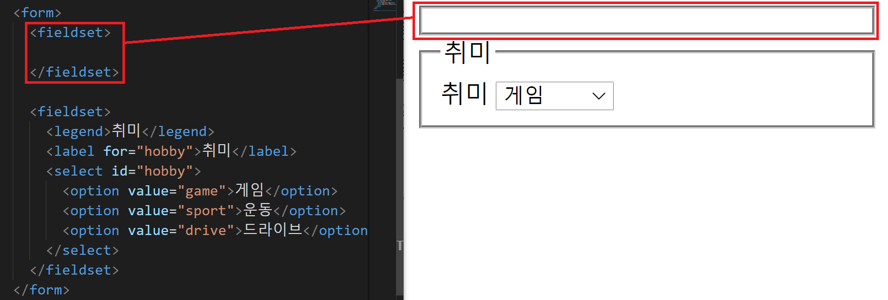<fieldset>이 박스를 그림으로서 양식의 내용들이 어떤식으로 그룹됐는지 알아보기 쉬워집니다.
