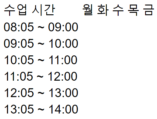 두 번째로 만들 시간표는 대학교에서 사용하는 시간으로 나눠져 있는 시간표입니다