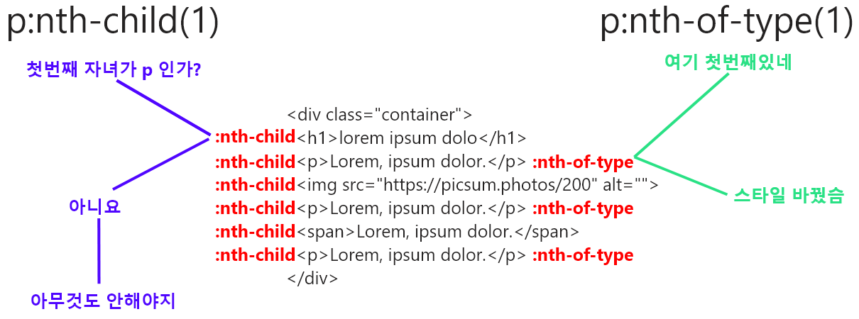 .container p:nth-child(1){...}은 컨테이너 요소의 첫번째 자녀가 <p> 인경우 적용됩니다