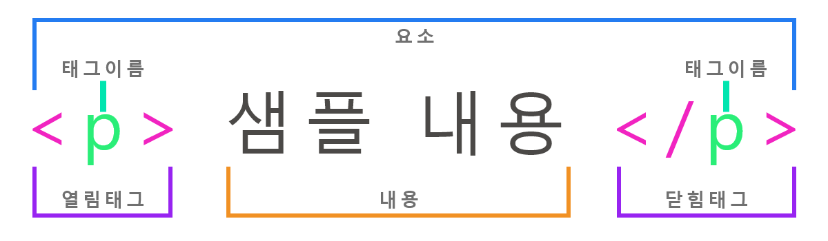 예를 들어 <p>샘플 요소</p>에서 <p>, </p>는 태그, 샘플 요소는 내용, 그리고 p는 태그 이름이다.