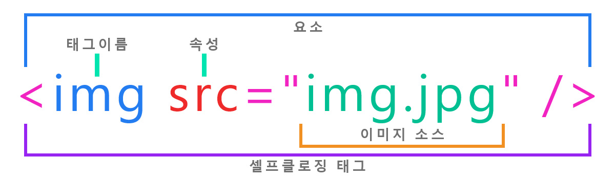 예를 들어 <img src="image.jpg" />에서 <img />는 태그 겸 요소, src는 속성, image.jpg는 이미지 소스, 그리고 img는 태그 이름이다.