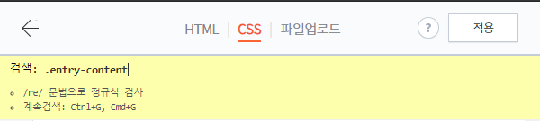 6. 스킨 편집 화면에 있는 CSS 파일에서 위에서 찾은 CSS 셀렉터를 찾으세요. Ctrl + f 으로 서치창을 열어 CSS 셀렉터를 쉽게 찾을수있습니다